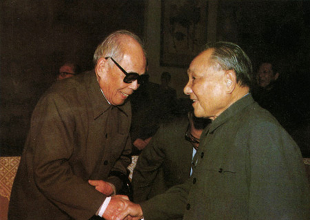 邓小平同志亲切会见全国人大常委会原副委员长、中国太平洋学会创始人、首届会长周谷城同志(摄于1988年11月)